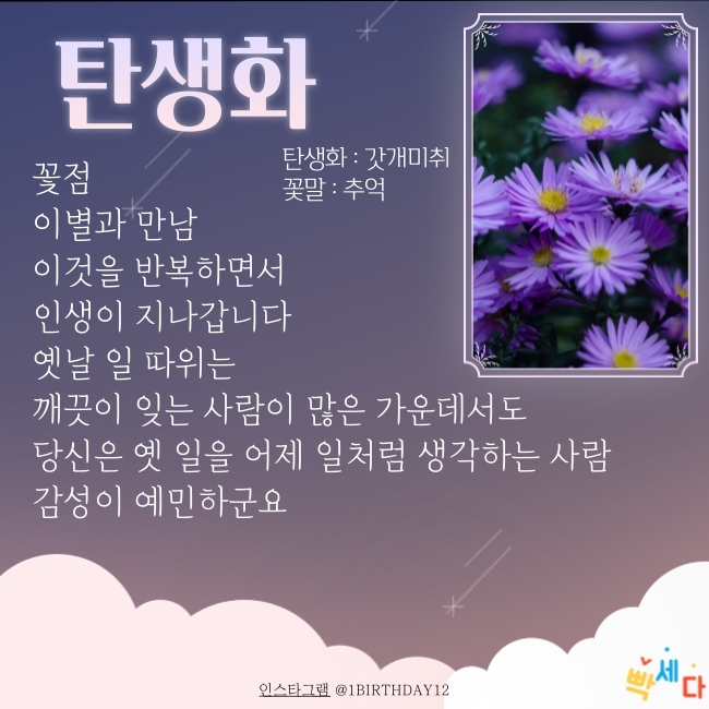 | 9월 8일은 무슨 날? 탄생화 탄생석 탄생목 9월 8일 탄생화는 갓 꽃점과 꽃말로 하루를 행복하게 (0) | 2020.11.10 |
