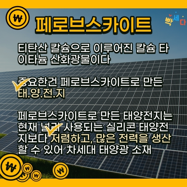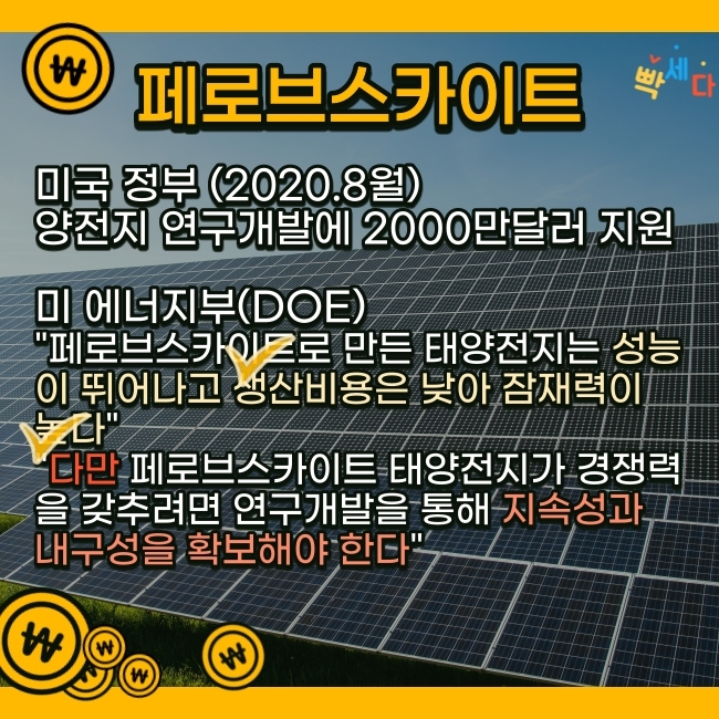 페로브스카이트 태양전지가 나온다면 원가도 저렴하고 많은 전력도 생산할 수 있고 주식을 넘어