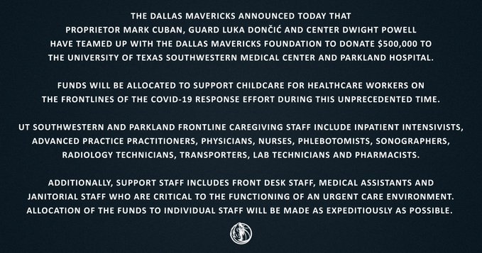 “The Dallas Mavericks announced today that Mark Cuban, Luka Dončić and Dwight Powell have teamed up with the Dallas Mavericks Foundation to donate $500,000 to support childcare for healthcare workers on the frontlines of the COVID-19 response effort during