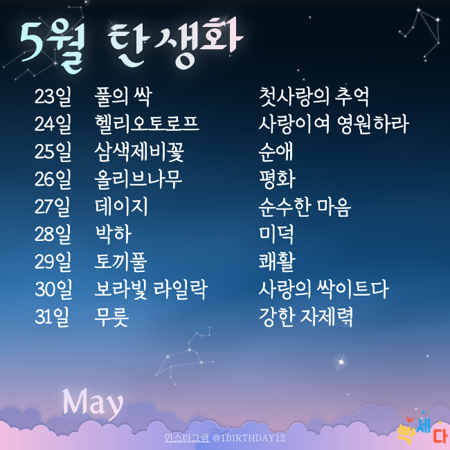 | 5월 27일 | 데이지 | 순수한 마음 | 바데라이트 | 인내 | 사시나무 : 야망 |