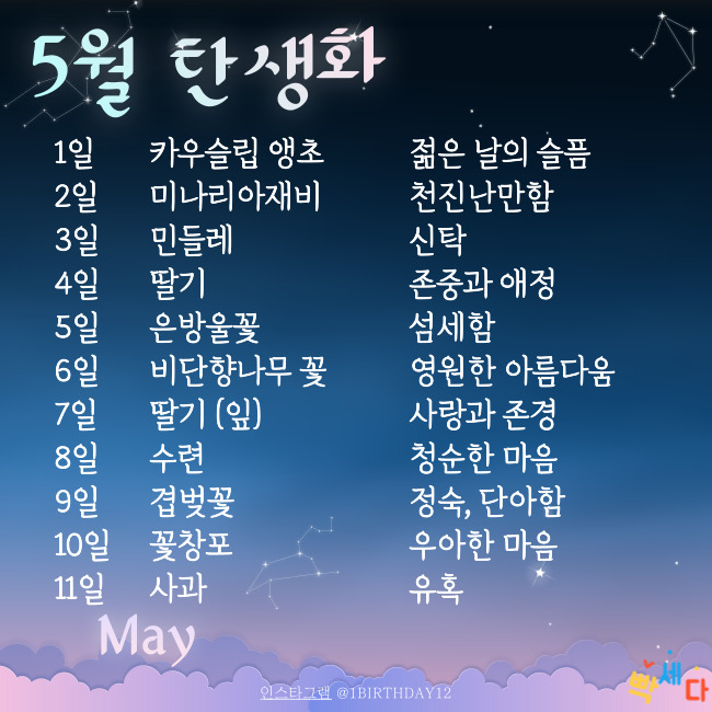 여러분 안녕하세요. 오늘 무언가 특별한 기분이 들지 않나요? 맞아요!! 5월 11일 태어나신 분들 모두 축하드립니다!! 5월 11일 자신의 탄생일에 대해 알아볼까요?? 5월 11일 탄생화 탄생석 탄생목은