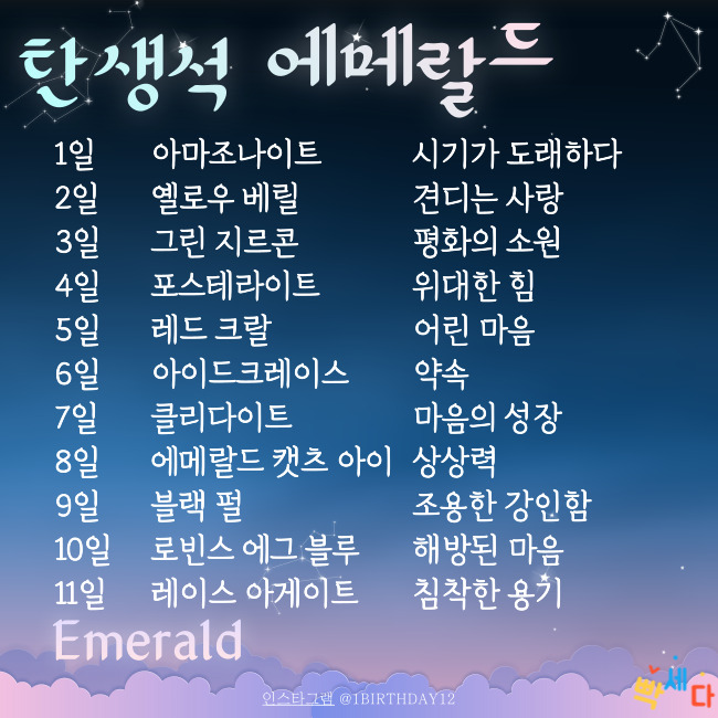 | 5월 7일 | 딸기 (잎) | 사랑과 존경 | 클리다이트 | 마음의 성장 | 미루나무 : 불확실 |