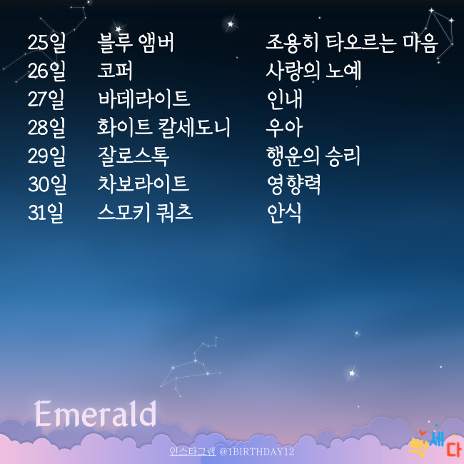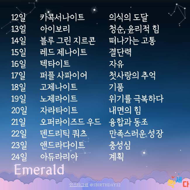 | 날짜 | 탄생화 | 꽃말 | 탄생석 | 의미 | 탄생목 / 의미 |