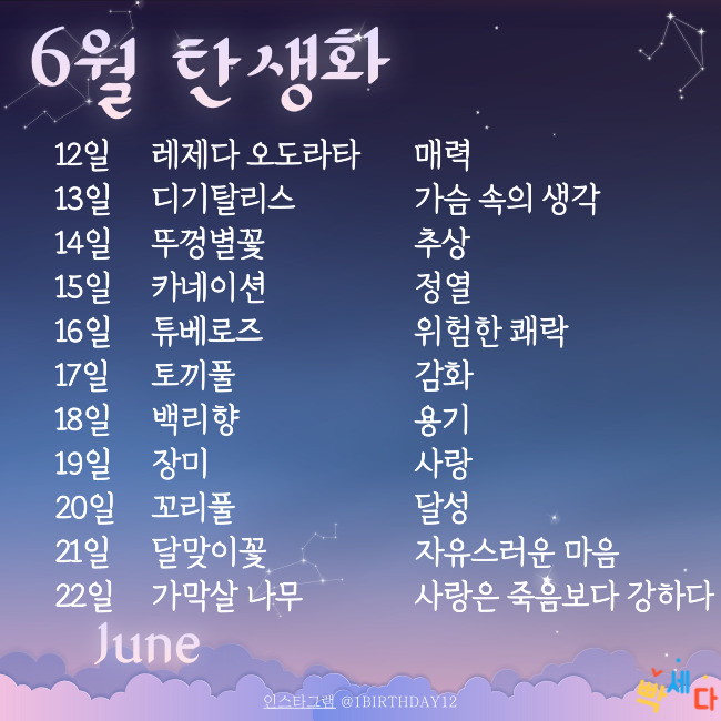 | 6월 13일 | 디기탈리스 | 가슴 속의 생각 | 우바로바이트 | 소심함, 마음을 빼앗길기질 |