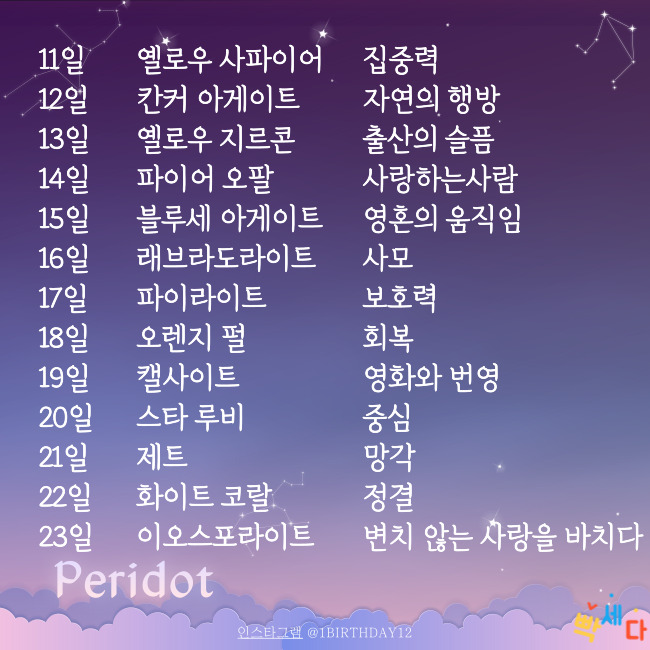 | 8월 11일 | 빨강무늬제라늄 | 위안 | 옐로우 사파이어 | 집중력 | 미루나무 : 불확실 |