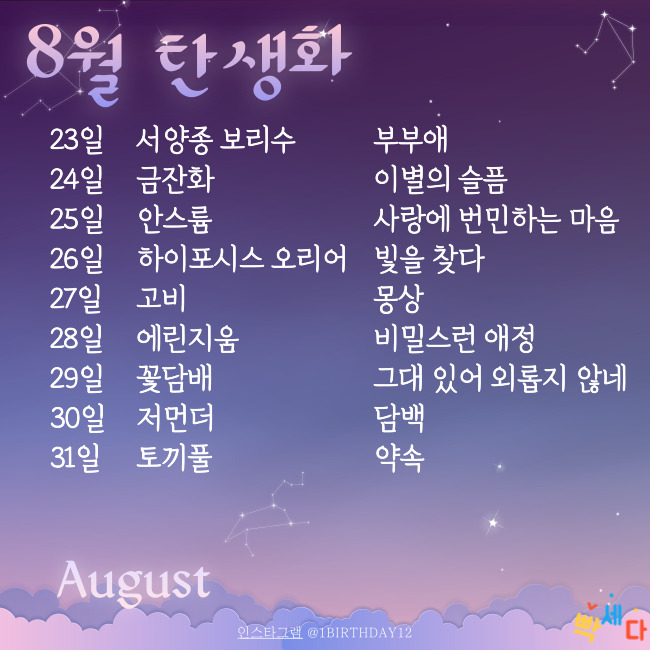 | 8월 24일 | 금잔화 | 이별의 슬픔 | 러버 | 연인 | 소나무 : 독특 |
