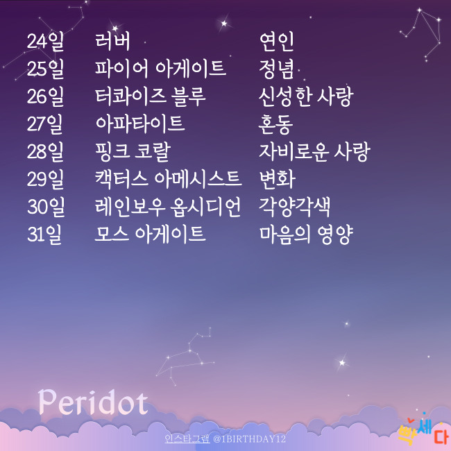 | 8월 6일 | 능소화 | 명예 | 다크그린 지르콘 | 정신의 위안 | 미루나무 : 불확실 |