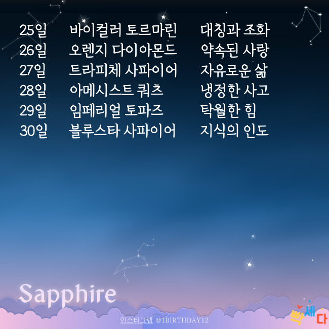 | 9월 30일 | 삼나무 | 웅대 | 블루스타 사파이어 | 지식의 인도 | 개암나무 : 비범 |