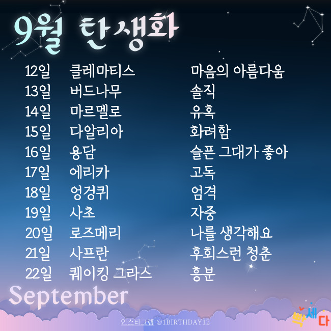 여러분 안녕하세요. 오늘 무언가 특별한 기분이 들지 않나요? 맞아요!! 9월 12일 태어나신 분들 모두 축하드립니다!! 9월 12일 자신의 탄생일에 대해 알아볼까요?? 9월 12일 탄생화 탄생석 탄생목은