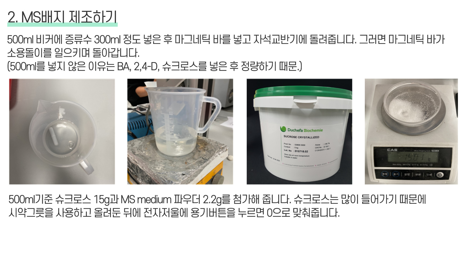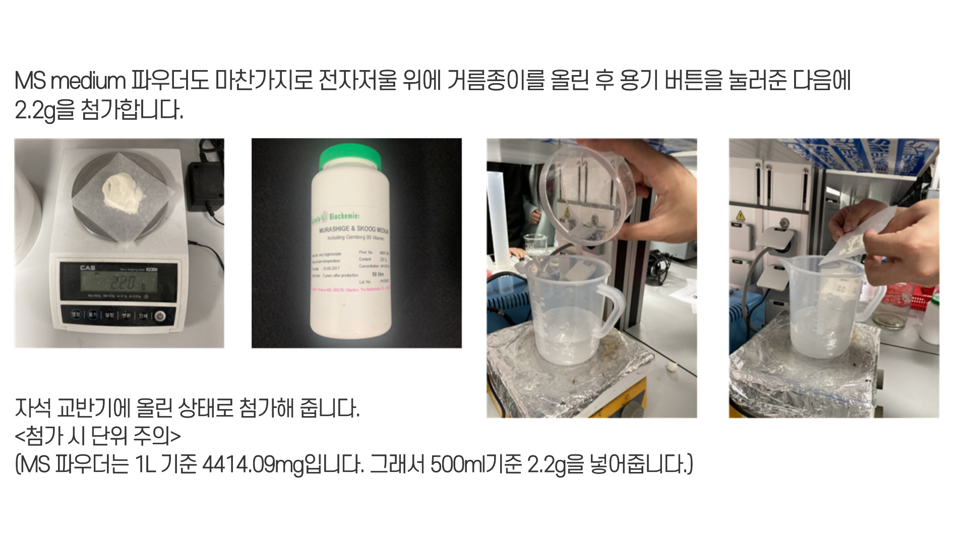 500ml기준 슈크로스 15g과 MS medium 파우더 2.2g를 첨가해 줍니다.