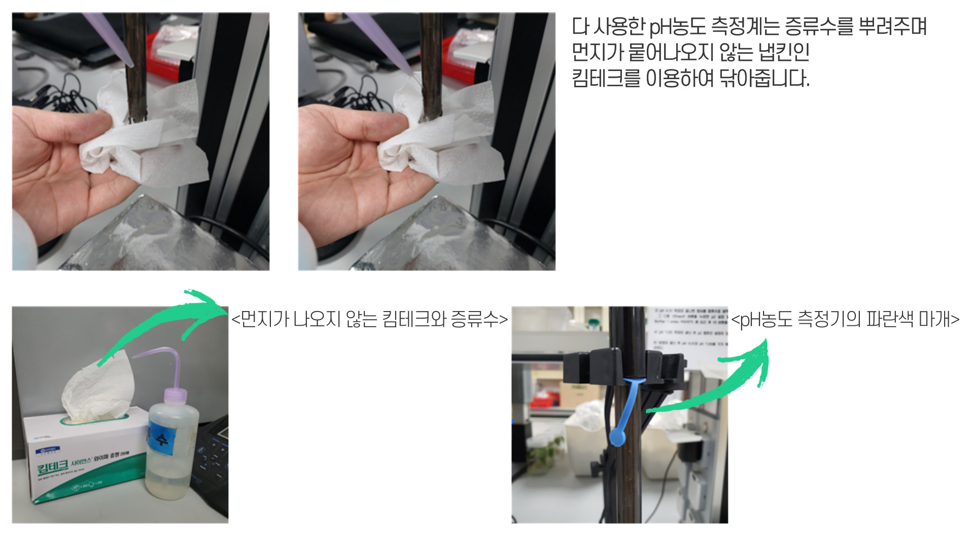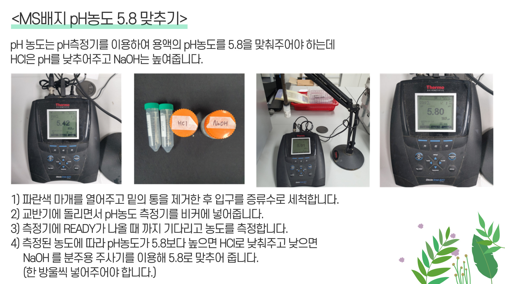 pH 농도는 pH측정기를 이용하여 용액의 pH농도를 5.8을 맞춰주어야 하는데