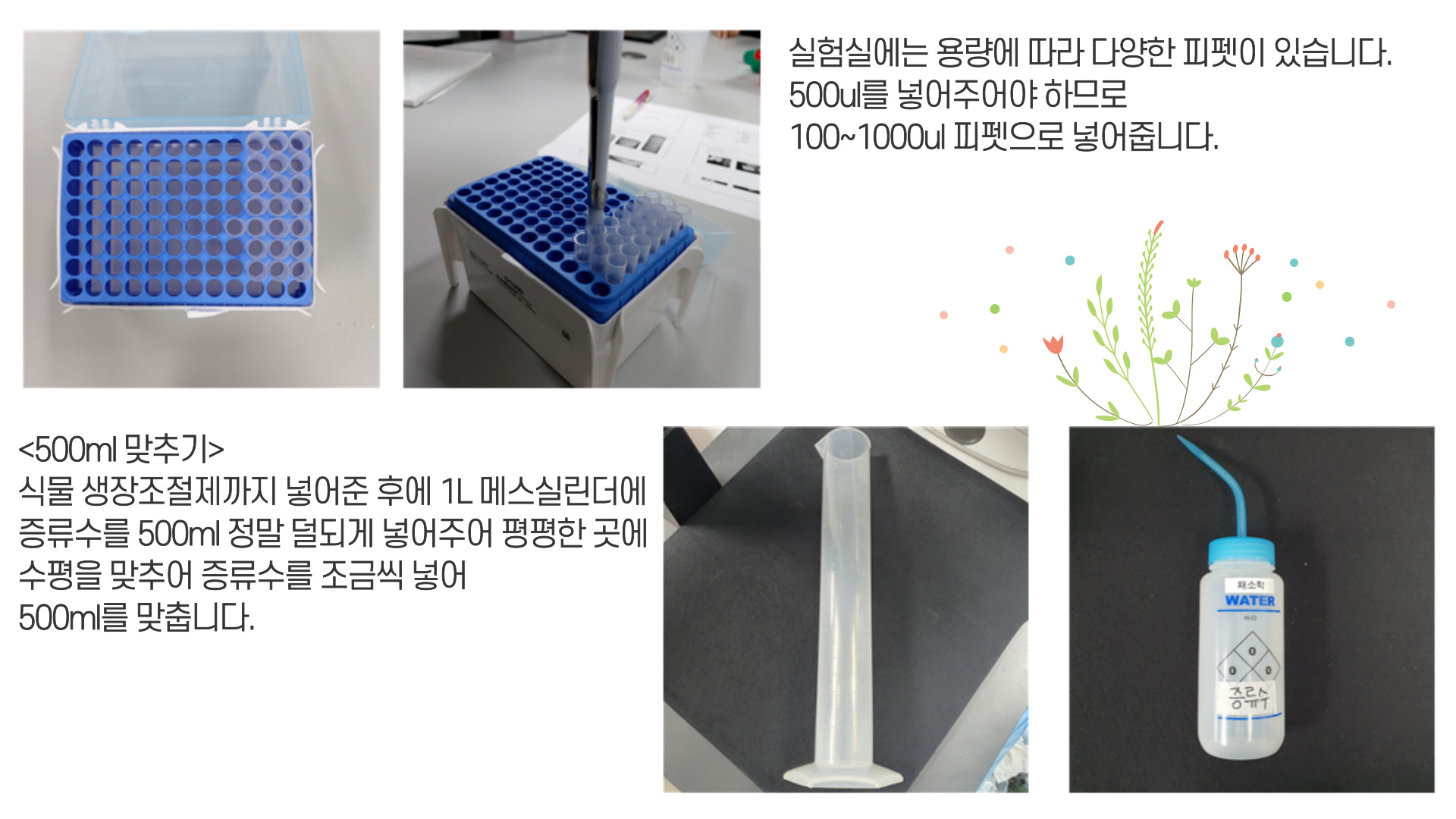 (500ml를 넣지 않은 이유는 BA, 2,4-D, 슈크로스를 넣은 후 정량하기 때문.)
