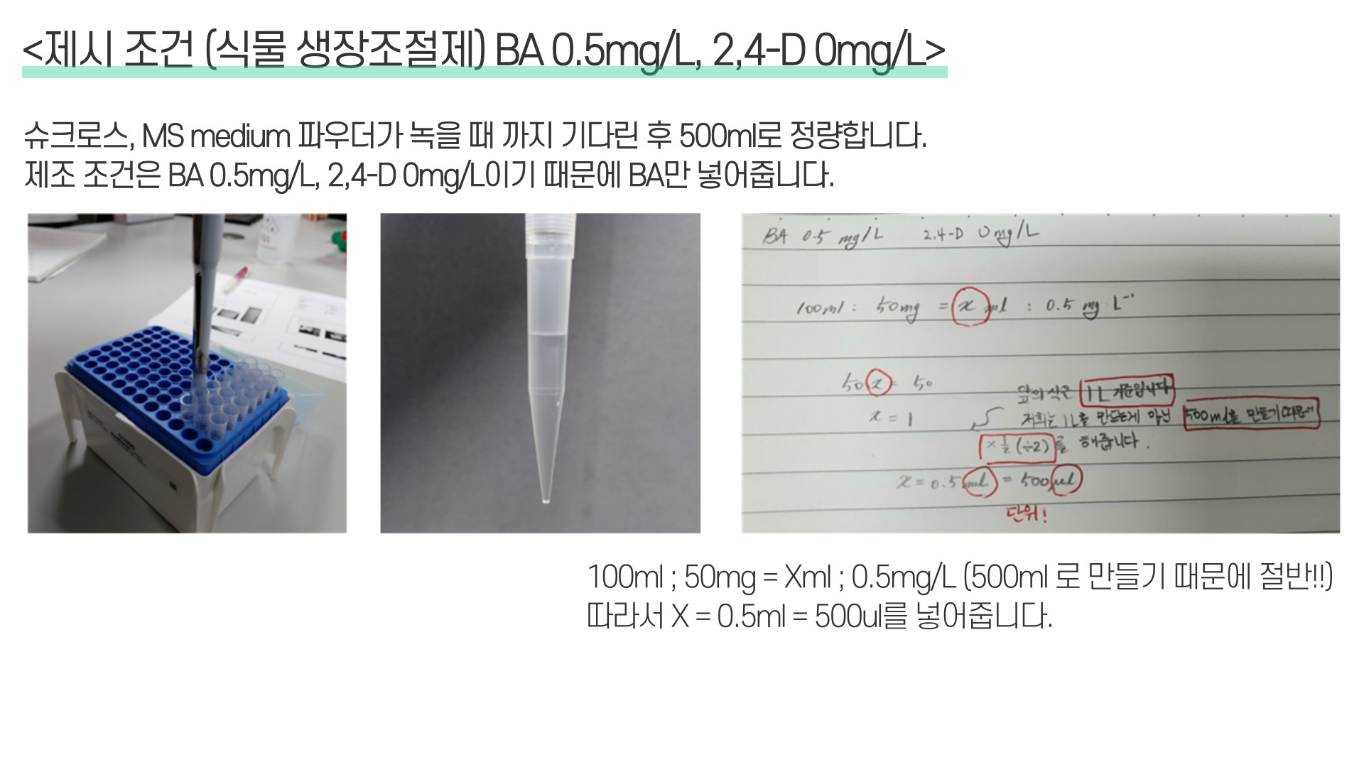 제조 조건은 BA 0.5mg/L, 2,4-D 0mg/L이기 때문에 BA만 넣어줍니다.
