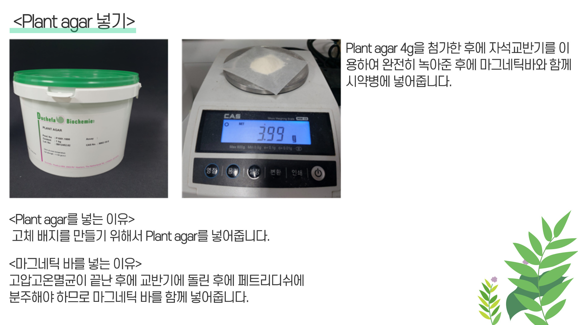 | Plant AGAR | 배지를 고체로 만들기 위함 |