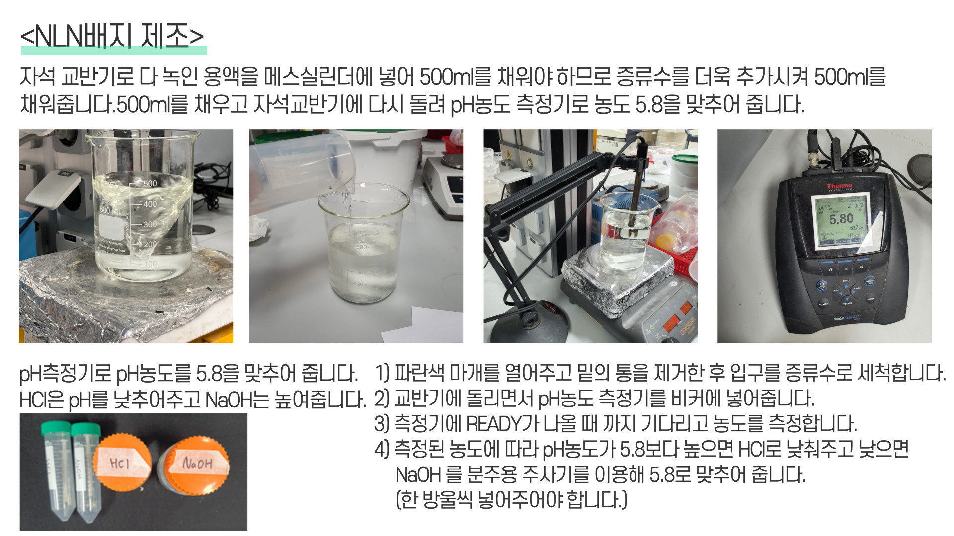 4) 측정된 농도에 따라 pH농도가 5.8보다 높으면 HCl로 낮춰주고 낮으면